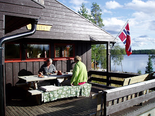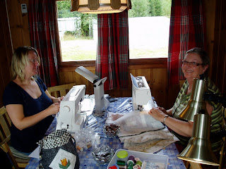 Helga 29 - 31 august arrangerte husflidslaget syhelg på Holbo i Mesnalia. Vi ble bare 3 stk som reiste på tur, men gjett om vi hadde det fint :-) Vi ankom hytta fredags formiddag i nydelig vær. Flott hytte med perfekt beliggenhet. Måltidene tok vi ute i finværet, da slapp vi og rydde plass på bordet inne.... Torild og Guri sitter og nyter god mat og godt drikke.