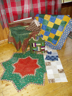 Først startet vi med bakstykke, deretter vatt. Så begynte fantasien..... Vi bare la lag på lag med stoffer som overlappet hverandre litt. Når vi var fornøyde med arbeidet, festet vi vannoppløselig plast oppå. Dette festet vi tett i tett med nåler slik at bitene ikke skulle bevege seg. Frihåndsquilting er den eneste måten vi sydde på. Utrolig gøy og spennende. Her ser dere noen av resultatene. De 2 øverste er helt ferdige, dvs at plasten er vasket vekk. De 3 andre er med plast på og ikke helt ferdige. Under hvert bilde står navnene til de som har sydd bildet: