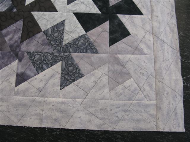 Her er første sammensying - og mønsteret kommer godt fram. Viktig og ha gode kontraster i denne teknikken for at det skal gjøre seg best mulig. I det ene hjørnet kan dere se at kontrasten ikke er god nok...... Ny ramme ble sydd på rundt.