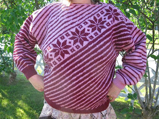 Se så fin jeg ble med genseren på :-) Om jeg skulle valgt farger i dag så hadde den nok sett litt svart/grå/hvit ut men koselig og ha en fargerik genser med en lang historie bak seg :-) Den passer fortsatt helt perfekt og skal bli god til kjølige dager. Utrolig at jeg ikke har tatt fatt i denne genseren selv - men det er vel en mening med alt............