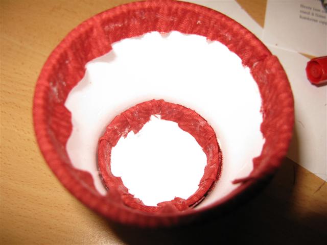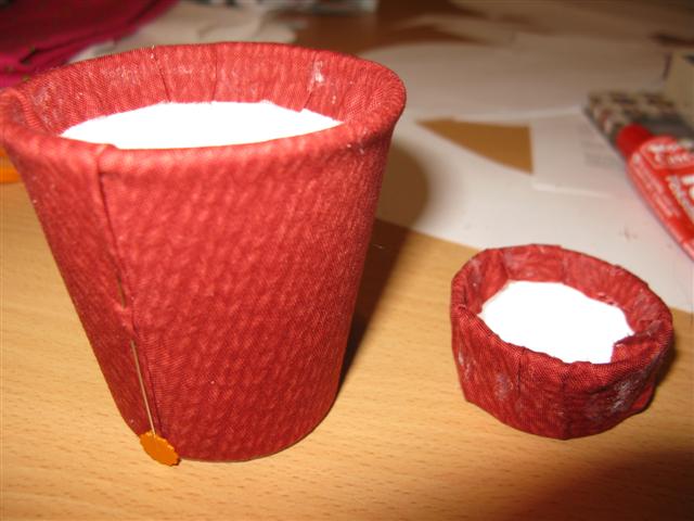 Nålpute laget av en isoporkopp. Skar av litt av bunnen og trekte delene med stoff.