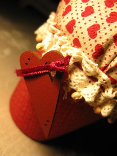 Nålputen kan pyntes som man vil. Jeg tok det røde båndet og flettet inn i blonden før jeg knøt det fast. Hjerteknappen var det hull i så den ble også bare knytt fast i båndet. Så nå har jeg fått meg en flott nålpute. Nesten så man blir sulten av og se på denne :-)))
