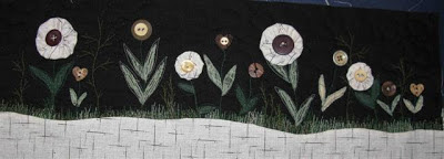Her har jeg laget noen Yo-Yo'er. De er blitt til noen dekorative blomster på dette arbeidet.