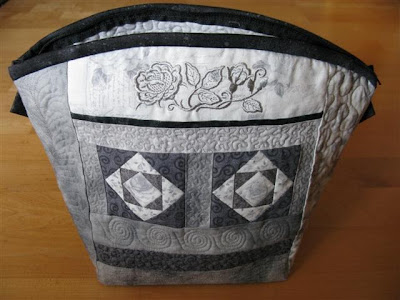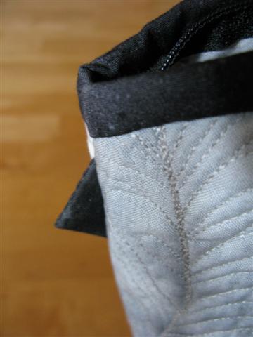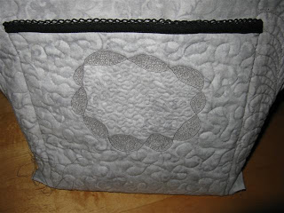 På lommene inni har jeg også quiltet. Her fikk jeg inspirasjon fra frihåndsquilting hos SewCalGal og har prøvd meg litt fram. Gøy og lære litt forskjellig. Øverst her har jeg brukt tre gråtoner på tråden når jeg quiltet.