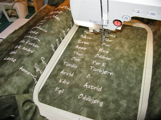 Har brodert mange navn - disse skal etter hvert brukes til navnelapper. Får jo ta i bruk de mulighetene man har når man skal lage slikt - altså symaskina :-) Planlegger fest for mine foreldre som fyller 80 og 85 år.