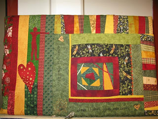 Her er baksiden av blokken. Hadde litt tykk vatt under når jeg broderte. Her har jeg klippet bort det meste av vatten. Det er bare vatt under feltene hvor broderingen er tettest. Dette skal bli midten på en round robin som vi starter med i Hamar quilten i kveld. Skal bli spennende å se flere av startblokkene - blir et prosjekt som kommer til gå noen runder rundt til andre - gleder meg. Dette er min første trapunto blokk også - skal bli gøy når jeg får den tilbake og skal frihåndsquilte den. Da vil de feltene med ekstra vatt under stå mer opp og bli fremhevet. Sender også med litt av det lyse stoffet som kan gå igjen flere steder i arbeidet.